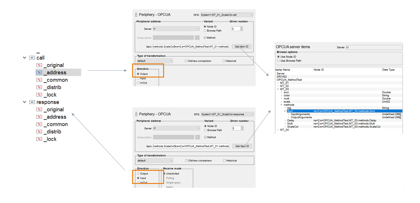 For the communication between client and server via OPC UA methods it is required to configure two datapoint elements so that one is used for transmitting method calls and one DPE is configured to receive the return values of the method. The two address configurations must be identical except for their "Direction".