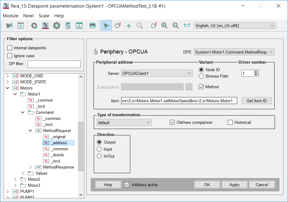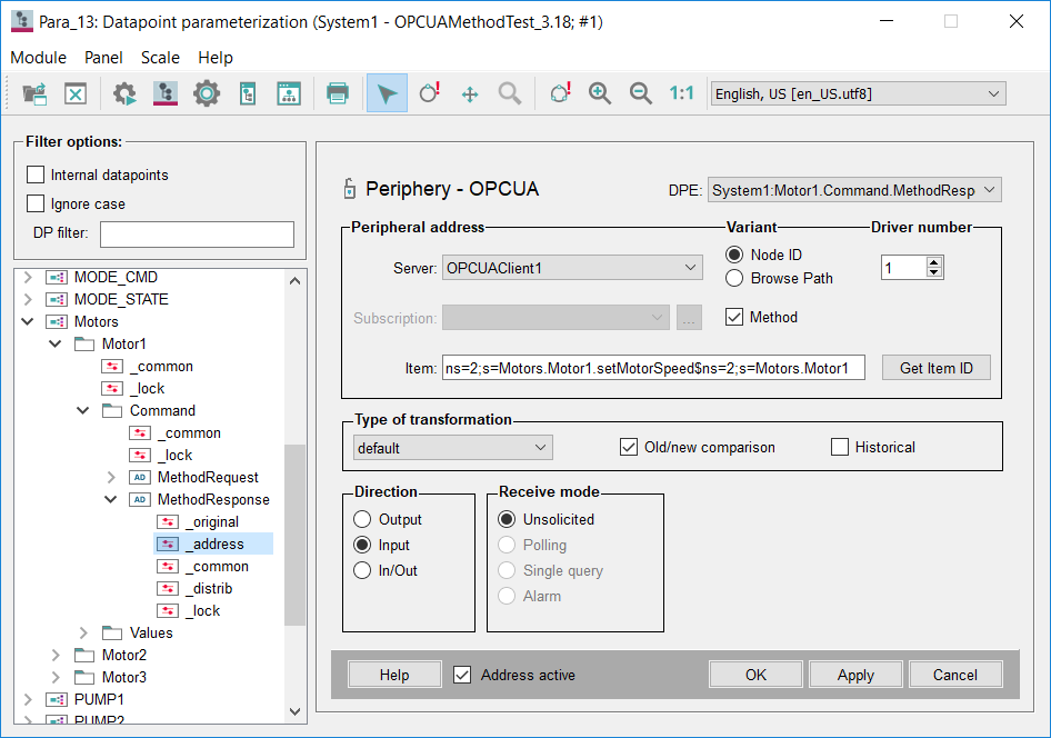 Within this example the OPC UA Server is used to publish an engine (Engine1). An OPC UA method (setSpeed) is used to pass the speed of the engine, so that the stated value can be written to the datapoint element. The method will be called using the WinCC OA OPC UA client.