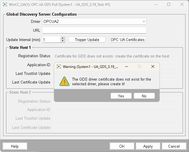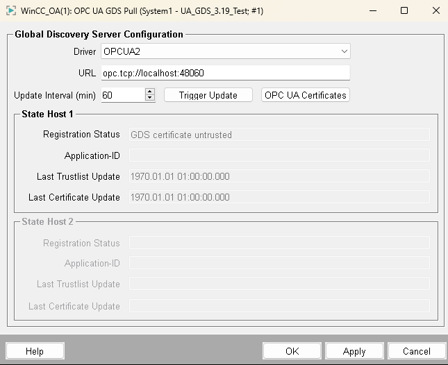 Using the Trigger Update button, the GDS interaction can be triggered. The WinCC OA OPC UA Client then has to be accepted in the GDS by selecting the client application and pressing the green OK symbol.