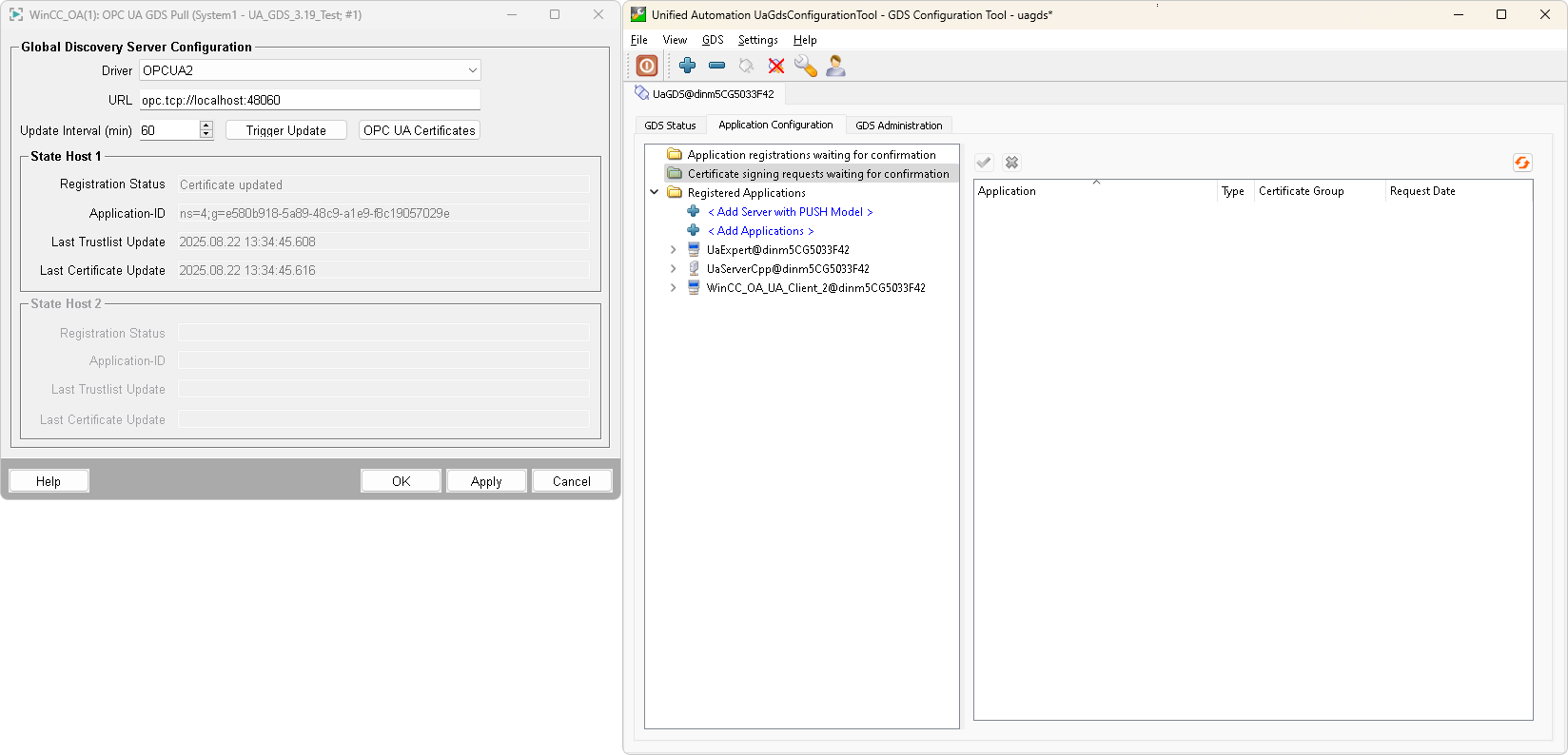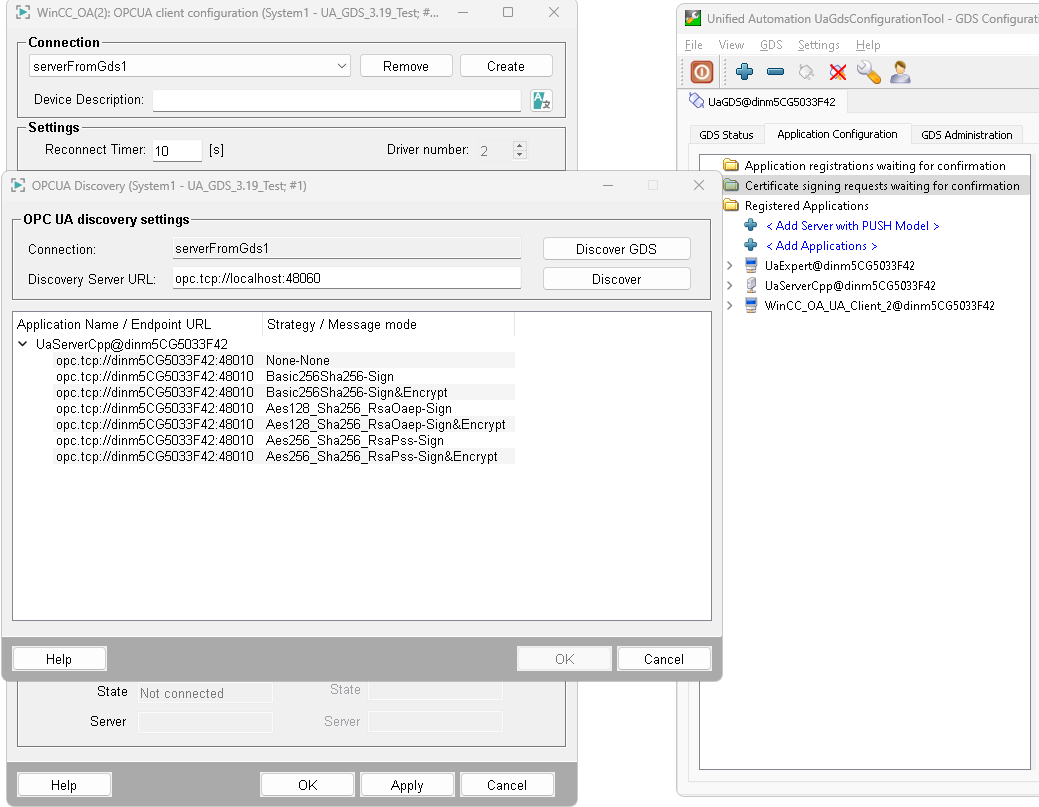 Any OPC UA application, either client or server, can register with the GDS and, once approved, create a signing request to the GDS that represents a Certificate Authority (CA). All UA applications belonging to the same security group then only need to trust the CA in order to trust all UA applications signed by that CA.