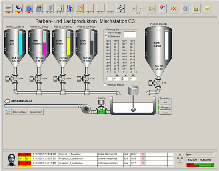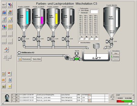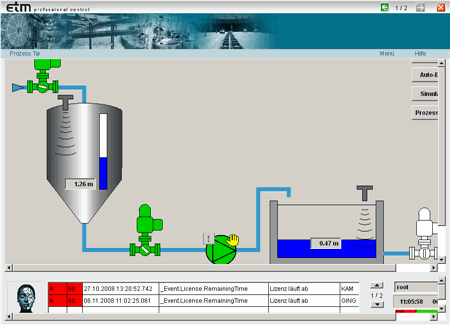 This module contains a three-line alert panel (see also Alert Panel) with scroll bar (name of the module in all three templates is "infoModule"). System information is displayed alongside, for instance details of the logged-in user, system time and date, hard-disk capacity and RAM utilization. If you right-click on the line displaying the current user a context menu opens containing various options (e.g. login, login as ..., User Administration). The size of the alert bar is adjusted automatically according to the resolution. Once again please refer to the WinCC OA DemoApplication Online Help for more details - WinCC OA DemoApplication - Alert handling, WinCC OA DemoApplication - User interface.