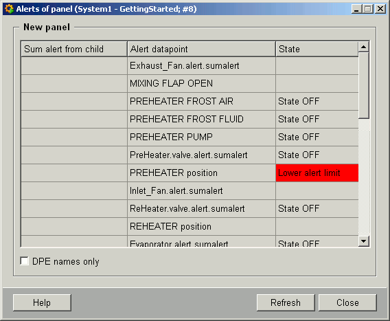 Clicking on any of the cells containing the three dots "..." opens another panel displaying details of the selected line. These details include the associated alert datapoints (DPE names can be displayed by enabling the lower check box) and the current status (range text) of the alert.