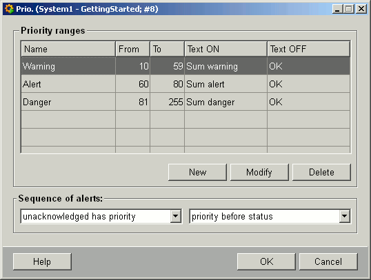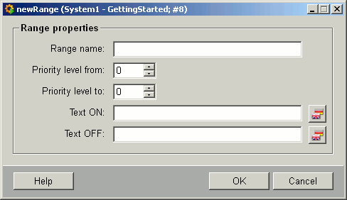 This panel lets you either edit/delete selected priority ranges or create new ones (using the buttons New, Modify and Delete). When you create a new priority range you must also specify the new range name, the priority and the range texts (for ON and OFF).