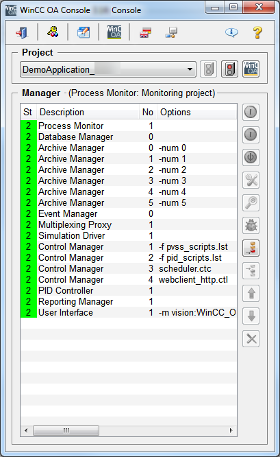 The WinCC OA version is shown in the heading of the console. When the console is opened the first running project is shown (see option -currentproj). If no project is running the project that was started last is shown. Choose a Project that should be started/stopped or edited, from the combo box. If another project is selected from the combo box the project started before is not stopped. The console allows to administer/edit several projects simultaneously although a project is running. Thereby, note that the different projects have to run with different port numbers (the port numbers can be set via the Change project properties button of the Project Administrator panel). In the lower part of the console the managers of the project as well as the associated manager number are shown. The status of the managers is visualized by the use of different colors. Further settings of the managers (e.g. command line options, start time, start type, ...) are shown when you scroll right. Also the process monitoring manager (Pmon) is shown in the list of managers. The manager list shows the mode of the Pmon. Also several consoles can be opened with the same project. The consoles communicate with the same Pmon.
