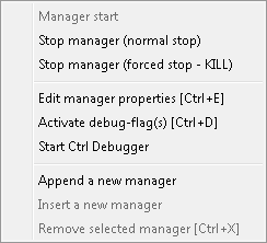 The functions available via the buttons are also available via a context menu in the console. Right click on an arbitrary manager to set settings of single managers via this context menu. Also hotkeys are available. These allow to open the single panels for the administration of the managers (e.g. Ctrl-L to lock the console, Ctrl-D for activating debug flags etc.). These hotkeys are visible in the tooltips of the buttons, in the context menu and in the heading of the particular panel.