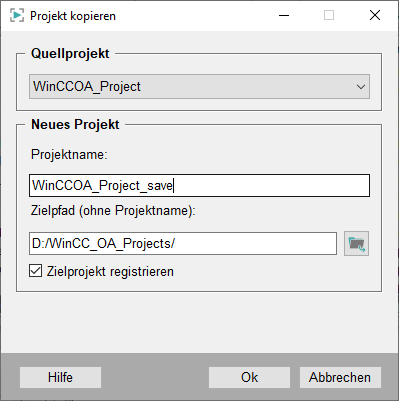 If the project, which should be copied, is located on the local computer "Project name_save" is suggested automatically as the new project name. If the source project is located on a remote computer the same name is suggested for the target project. The project name can, of course, be changed individual!