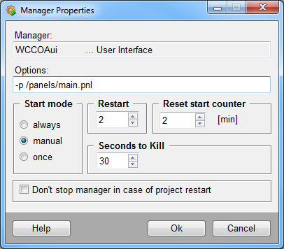 - Don't stop manager in case of project restart: Does not stop the selected manager when the project is restarted (e.g. the UI Manager is not restarted in a redundant system if an Archive Manager crashes).