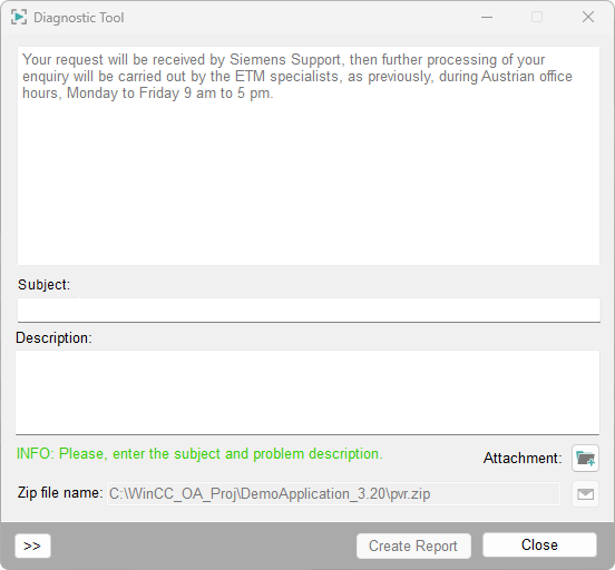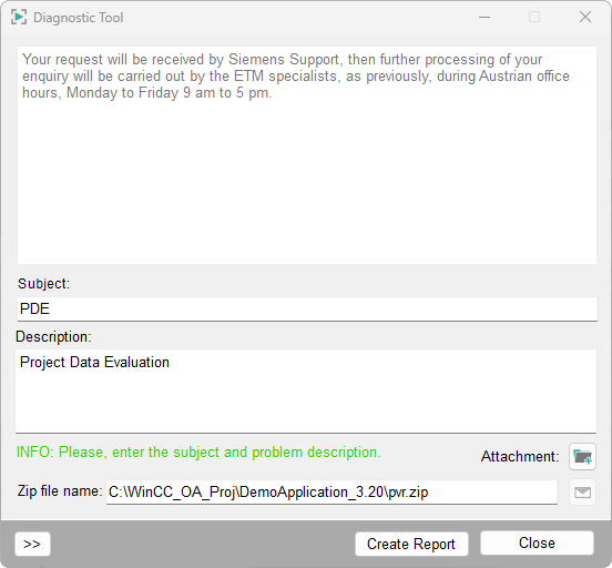 - If your own analysis of the project data did not solve the problem and you want to contact the ETM support (support.automation@siemens.com). By sending the report package to our support team the problem can be solved more easily and the reaction time can be shortened, as all relevant data that is necessary for the analysis is included in the report package or can be added easily.
