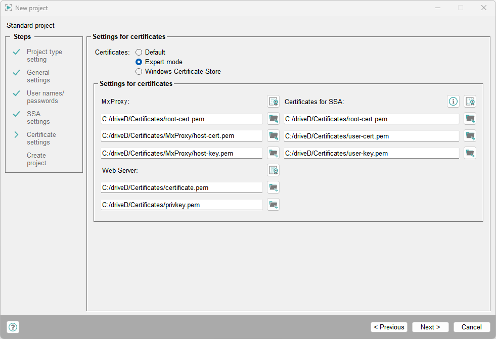 The Expert mode certificates (.pem) must be created manually. If certificates already exist, you can select them by using the file selector. Select the option Expert mode and click on Next.
