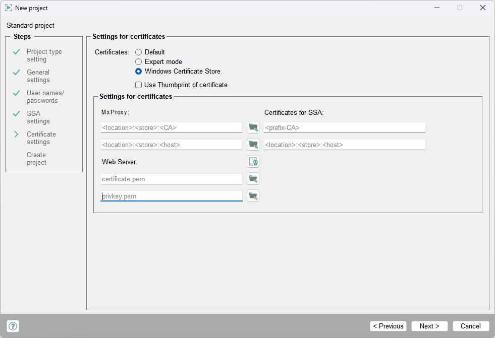 If you tick the check box Use Thumbprint of certificate, enter the thumbprints of the certificates to the certificate text fields (see the screenshot below). Furthermore, you must use the thumbprints for the config entries in the config file - see chapters Multiplexing Proxy Certificates with Thumbprint and SSA Certificates with Thumbprint.Figure 9. Use Thumbprint of certificate - Thumbprint certificates