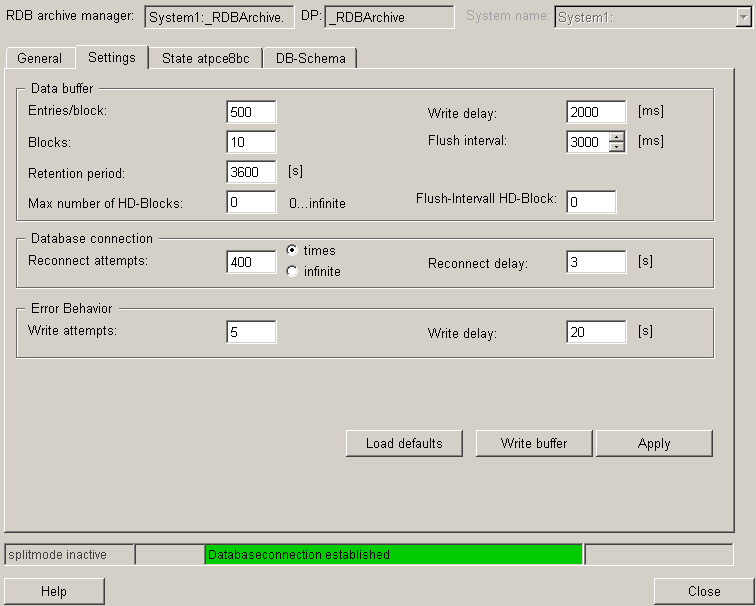 Apply: If you change any value in a text box, you can click Apply to confirm the changes. The values are then written directly to the internal datapoint of the RDB Archive Manager and are then valid for this manager (time depends on parameter).