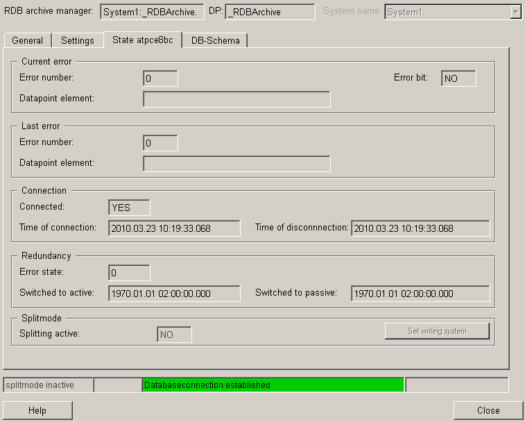 Error state : Internal RDB Archive Manager error state. If the WinCC OA system is redundant, the two RDB Archive Managers can identify which manager has the lower error state.