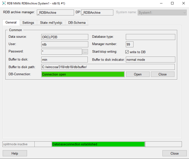 DB Connection: Shows the status of the database connection. You can use the button Open to open the database connection and Close to close it. If you close the connection, the data is buffered. When you open the connection by clicking the open button, the data is processed and values are written into the database.