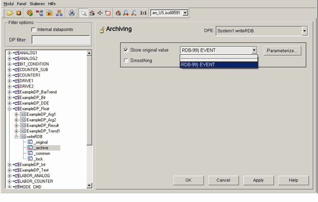 In order to activate archiving, enable the Store original value checkbox and select the RDB archive (in the figure RDB-99) EVENT). If there are multiple archive groups, you can select the specific RDB Archive Manager from the combo box (for example, RDB-99) Drive).