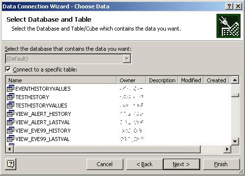 If the details are correct, click the Next > button to connect to the desired data source. The following Connection Wizard dialog shows the tables and views in Oracle for the logged-in user.
