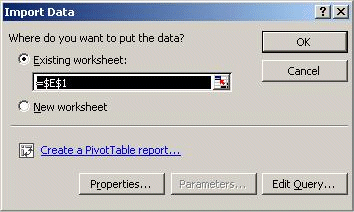 Open the selected data source for reading by clicking the Open button. The next step is querying the data. The Import Data dialog allows selecting the worksheet cells you want to fill and to make any corrections.