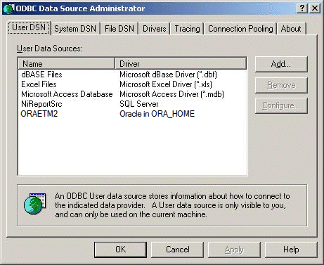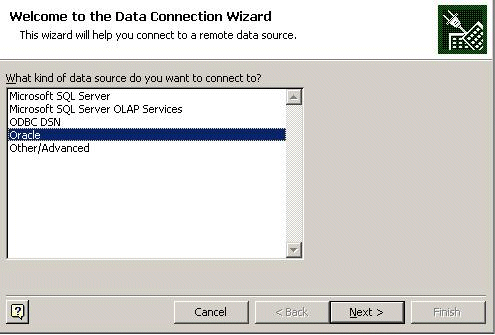 If you have not already done so, register Oracle as a new ODBC data source in the system. You can do this in the Windows XP Control Panel under Administration, Data Sources (ODBC). The settings are similar in other Windows versions.