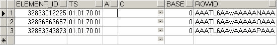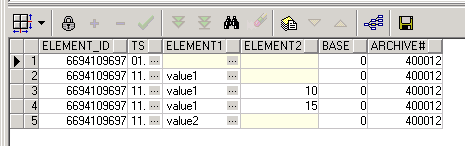 A table always contains the columns ELEMENT_ID and TS (Primary keys), as well as the SYS_ID (for partitioning) and BASE (for copying base set from exported archives to the oldest online archive) columns. The individual datapoint elements are single columns of the database table.
