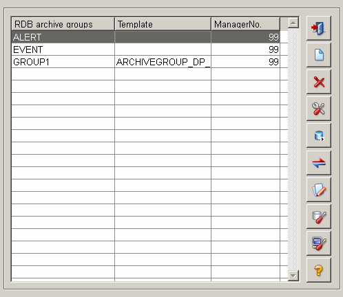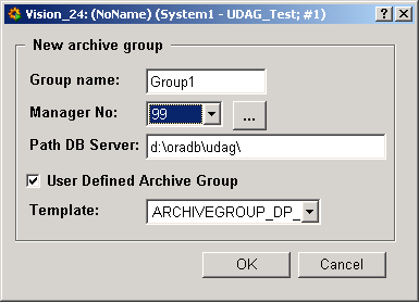 Specify the name for the group. The manager number is the number of the RDB archive manager in the console. Activate the User Defined Archive Group checkbox and select the created template from the combo box. Click on OK. The archive group "Group1" is created and shown in the RDB file selection panel (see figure earlier on).