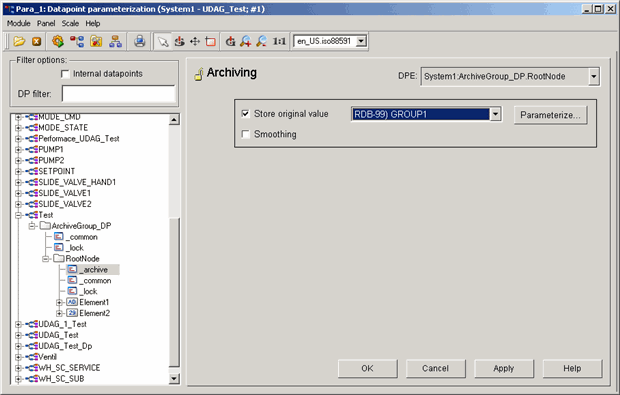 Open the PARA module. Add an archive config to the root element of the created datapoint "ArchiveGroup_DP". Select the created archive group "Group1" from the combo box and activate the Store original value checkbox. Click on OK. Check that the RDB archive manager with the number 99 is running in the console.