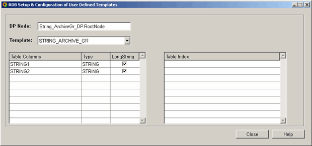 In order to configure strings, open the RDB Setup and configuration of User Defined Templates panel through the System management panel -> Database tab -> RDB Archive Groups -> Manage Templates button -> New Template