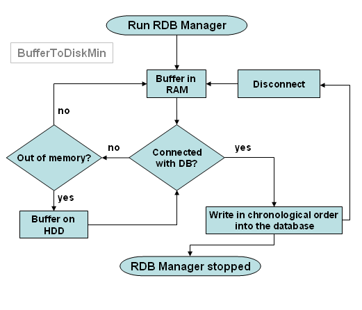 The BufferToDisk functionality solves this problem by using additionally the capacity on the local HDD. Depending on the BufferToDisk mode (BufferToDiskMin or BufferToDiskMax) the buffered data are saved on the local HDD before an overflow of the RAM or/and an abrupt crash of the RDB manager.