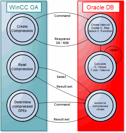 The user does not intervene directly in the database. All actions are launched from WinCC OA and the Oracle RDB database returns the requested information. Once a compression has been added to a datapoint element, the compression calculation can be started in defined intervals.