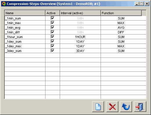 With a click on this button the compression step with the set parameters is created. An information dialog informs you whether the creation process was successful. If an error occurs, check whether a compression step with the same interval and function already exists.