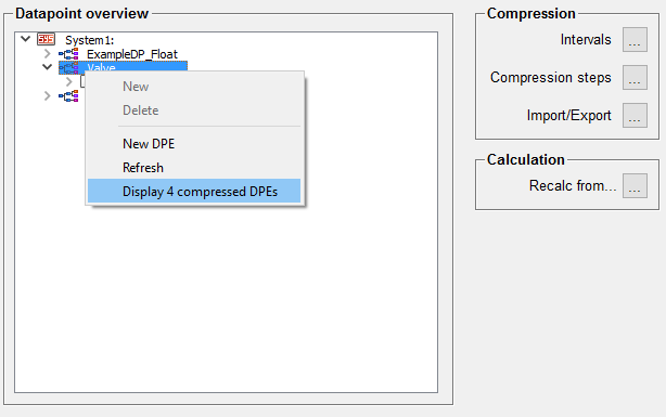 In the case that for specific datapoints at a master datapoint a compression calculation should not be carried out, its compression calculations have to be deactivated (see Activating/Deactivating compression calculations) and/or deleted afterwards (see Deleting compression calculations). Note that the tree view has to be refreshed (Refresh option from the context menu) in order that the changes are shown correctly.