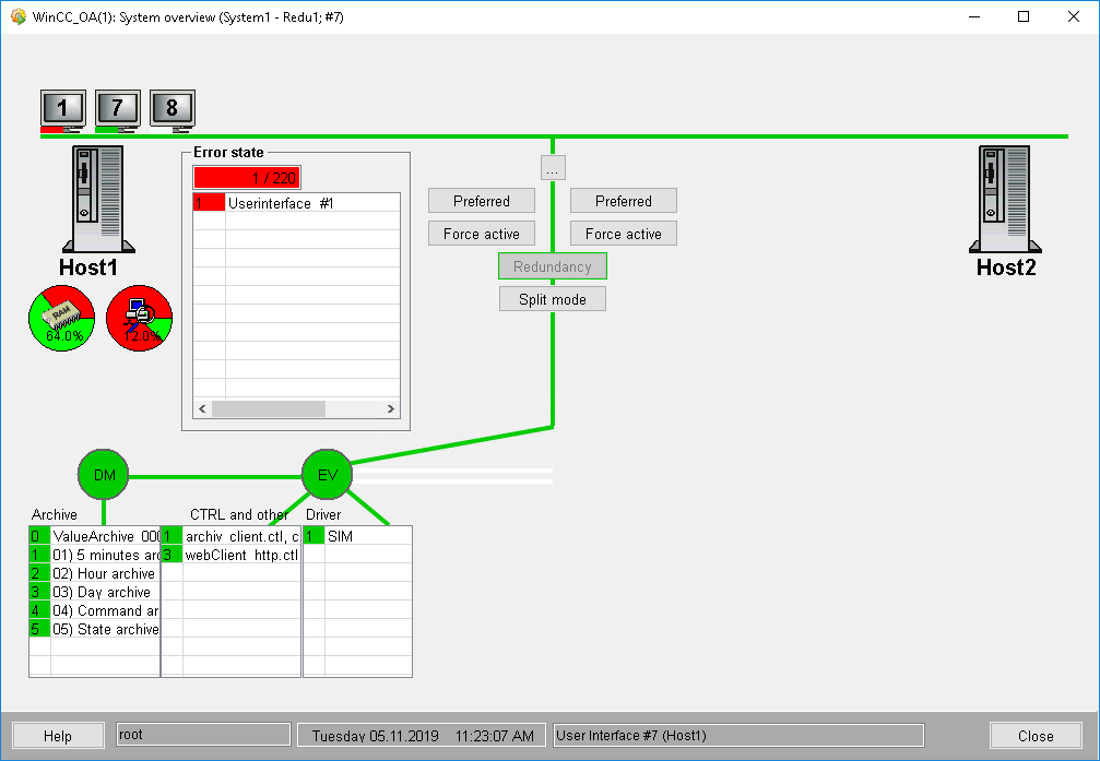 If the redundant project is additionally distributed (this means that the redundant system is connected to further WinCC OA systems) there are two additional buttons with the name Active Dist and Active Event in the split mode. Via the button Active Dist you specify which Dist Manager should be active. Since the single systems communicate via the Dist Manager in a distributed system and the Dist manager always contacts the active Event Manager, the active Dist Manager has to be specified in the split mode (since both Event Managers are active in this case).