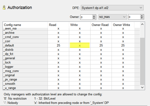 The authorization level (bit) is inherited from the higher-level node or if an authorization level was not defined for the higher-level node, the authorization is inherited from the _System datapoint. x (inheritance) is the default setting. |