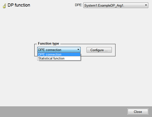 When you select the "dp_fct" config the following panel is displayed. The top field displays the name of the datapoint element to be edited. In the Function type combo box you can choose between