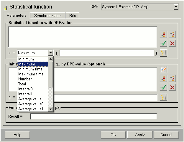 You can assign a function to a datapoint element via a config panel. In this way you can implement mathematical links between datapoints. The datapoint function contains one or more parameters used to calculate the value of the defined function and to assign it to the original value of the datapoint element. The permissible parameters p1...pn are the "original" or "online" values of elements of other datapoints.