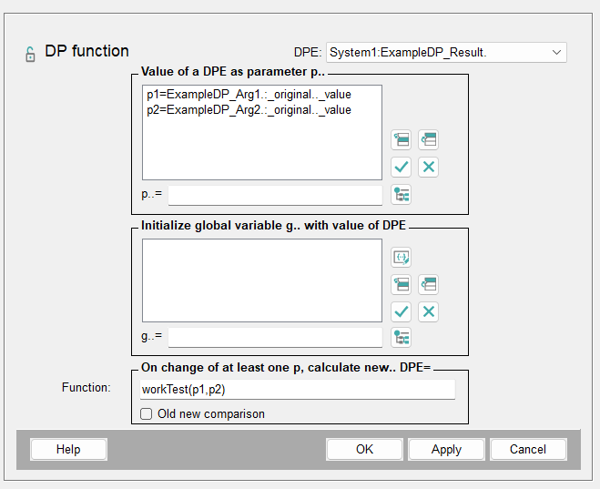 The function itself is defined as a mathematical link of the parameters. Of course, you can also assign DP functions to datapoints in Control scripts using dpSet() (see User Manual, Control Functions).