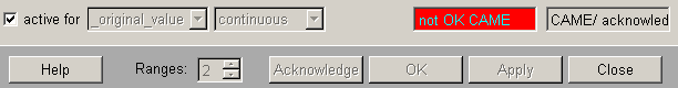 - continuous: Since there are no WENT events, only the acknowledge types "acknowledge deletes" and "CAME is acknowledgeable" are allowed. In addition it is possible to handle a quick 0-1-0 pulse where the signal edge from good range (0) to alert range (1) triggers the alert. The WENT event is ignored. This means that the alert is displayed as "CAME/not acknowledged", though it is already gone. The alert remains till it is updated by the next impulse or deleted by acknowledge. Impuls alerts for alert handling of continuous values can only be used for data type bool.
