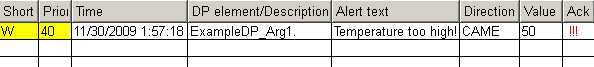 - CAME or WENT must be acknowledged: Every alert range can be in one of four states "CAME/unacknowledged", "CAME/acknowledged", "WENT/unacknowledged" or "CAME/disabled". Normal state is only achieved by a going value change AND by acknowledging. For acknowledging either the "CAME" alert must be acknowledged in the state "CAME/unacknowledged" or the "WENT" alert must be acknowledged in "WENT/unacknowledged" state. Only acknowledge ONE of the pairs!