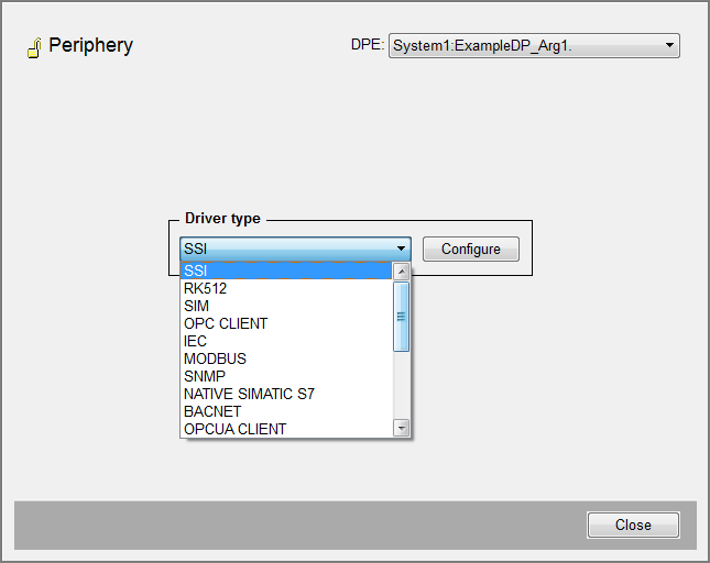 The config "_address" is used to manage the peripheral addresses of datapoint variables in WinCC OA. If you want to configure the peripheral address of a datapoint element, open the Configuration menu. Here, select one of the driver types used in the respective project.