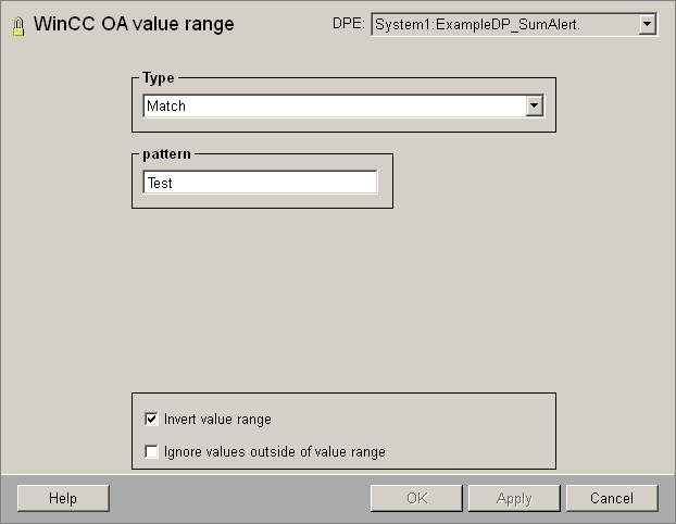 Some data types allow pattern matching. The pattern is entered in the PARA panel WinCC OA value range match. For bit pattern matching, begin with the last digits. The following example excludes the texts containing "Test" as text for a group alert.