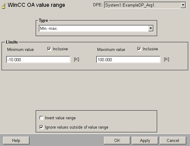 Negate : the WinCC OA value range is the range outside the specified limits.