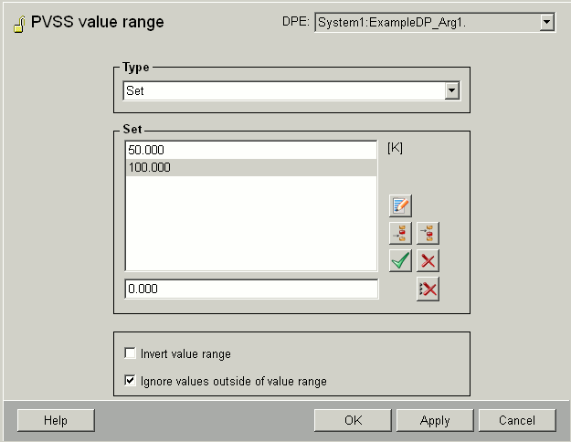 If you want to monitor a datapoint variable for a violation of the WinCC OA value range a configuration panel is displayed for the specific data type.