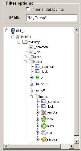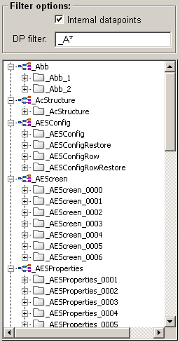 If the datapoint filter e.g. "_A*" is set, the tree shows the datapoint types that contain datapoints beginning with _A. This filter is applied to all datapoints, i.e. including "internal datapoints".