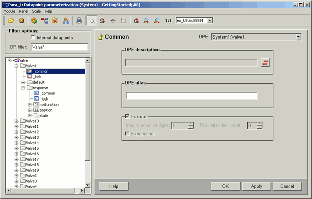 You can see an example for the datapoint type configuration in the figure below. The PARA tree shows an opened datapoint type (=DPT) "Valve1". This contains nodes and leaves. The "common" config of the "Valve1" datapoint element is selected. The Config panel for "common" is displayed in the right part of the PARA panel (by double-clicking on "common").