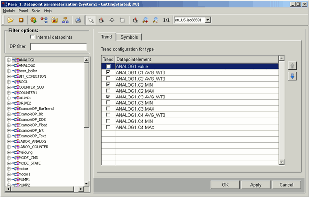 In order to display all internal and non-internal datapoints, click on the Internal datapoints check box. Type for instance the search pattern "_A*" in the "DP filter" field and confirm with enter.