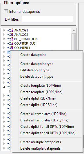 You can open the context menu of the Datapoint-type Editor by clicking the right mouse button. The context menu is shown in the figure below.