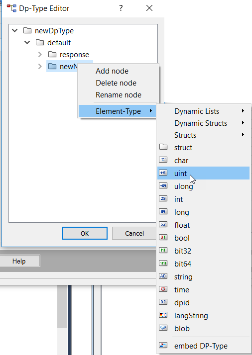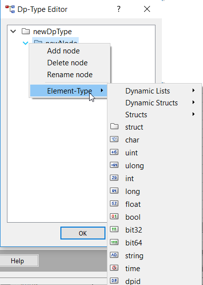 You can change the data type of a node using Element type. This menu option lets you assign other data formats to end nodes (leaves). See Figure above ("The context menu of the Datapoint type Editor").