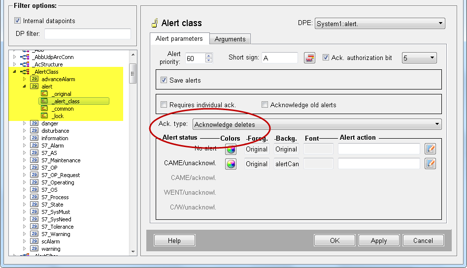 - Set the acknowledgement type "Acknowledge deletes" for an alert class in the internal datapoint _AlertClass by selecting the desired alert class. In the figure below the acknowledgement type "Acknowledge deletes" was selected for the alert class "alert".