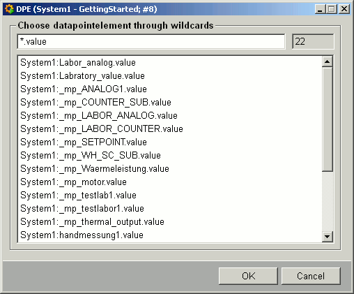 When you select datapoint elements, the "DPE" combo box allows you searching by patterns (wildcards). Enter a pattern (for example, "*.value") and pressing Enter opens a panel displaying the datapoint elements matching the pattern. In this panel, you can select individual DPEs for adding them to a configuration by double-clicking on them or selecting them and clicking "OK". For further information about wildcards, see the section Wildcards.