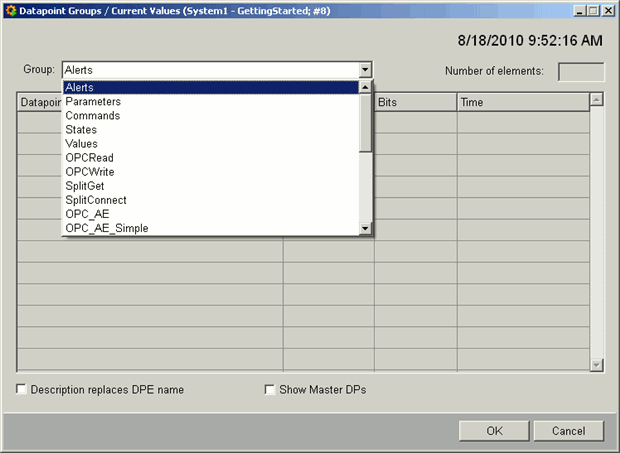 You can select a datapoint group from the Group combo box and either add the entire list or parts of it to the DPE monitor panel (by clicking OK). The table displays the individual elements belonging to the DP group. You can set further display options by activating either of the Description replaces DPE name and Show Master DPs check boxes. The Number of elements field at the top right shows the number of elements belonging to the selected DP group.