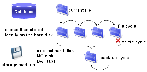 The file cycle chosen depends on the amount of data being collected and the importance of the data. The closed database files are archived on another storage medium according to the storage cycle. Daily or weekly archiving is typical.