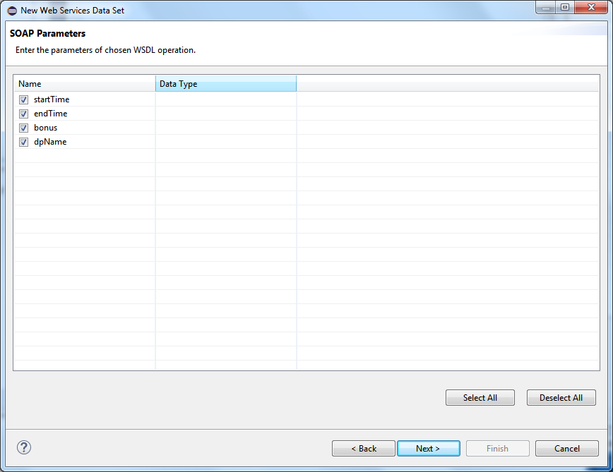 Shows the parameters that are available for the configuration. Select the parameters and click on Next>